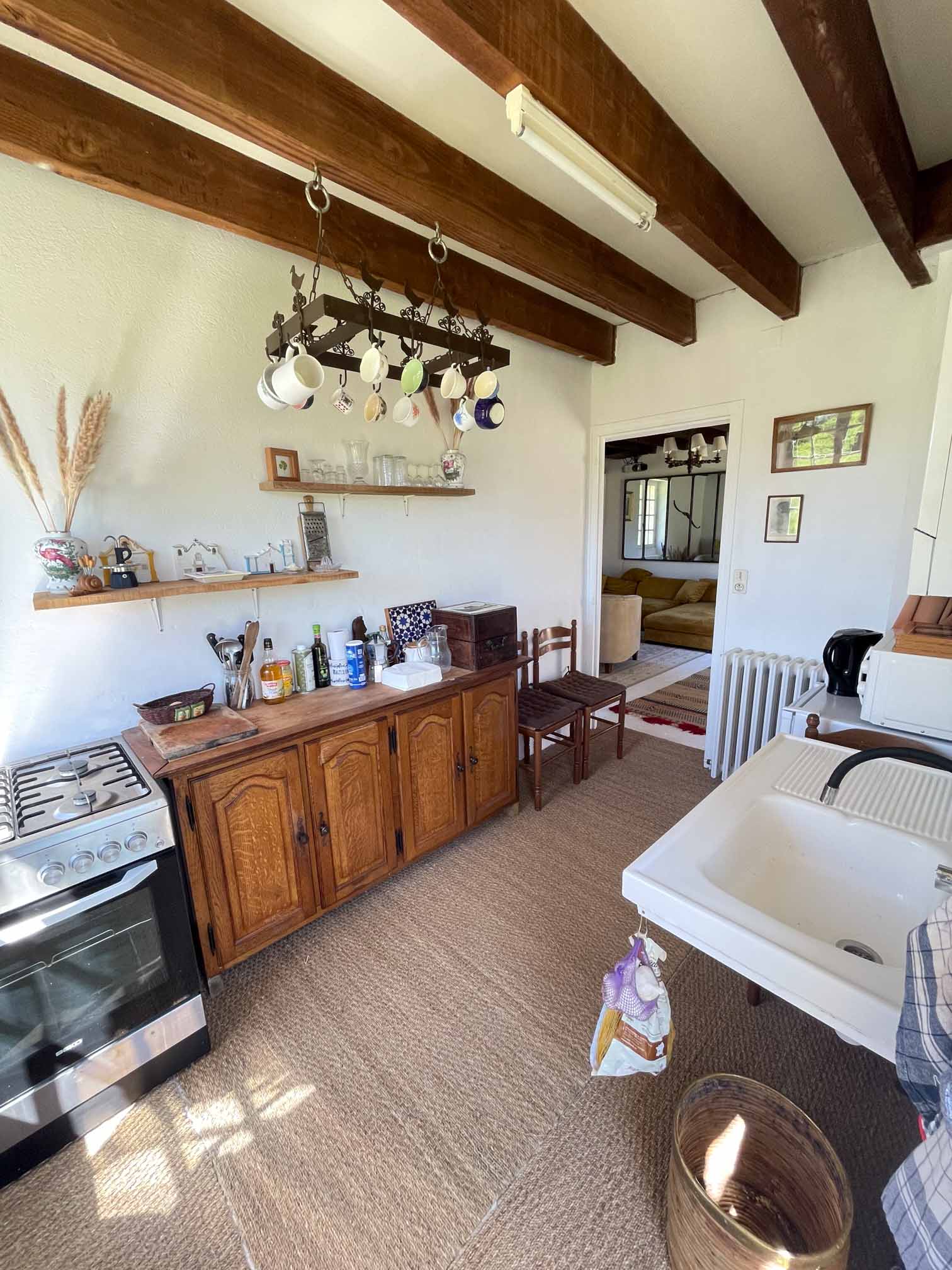 À l’extérieur, la terrasse en L se prête aux repas en plein air, accompagnés du chant des ruisseaux qui bordent le jardin. Barbecue, brasero et mobilier élégant complètent cette atmosphère conviviale, propice aux instants précieux.